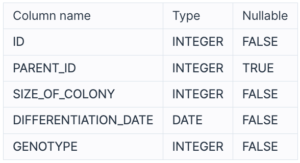 다음은 실험실에서 배양한 대장균들의 정보를 담은 `ECOLI_DATA` 테이블입니다. `ECOLI_DATA` 테이블의 구조는 다음과 같으며, `ID`, `PARENT_ID`, `SIZE_OF_COLONY`, `DIFFERENTIATION_DATE`, `GENOTYPE` 은 각각 대장균 개체의 ID, 부모 개체의 ID, 개체의 크기, 분화되어 나온 날짜, 개체의 형질을 나타냅니다.