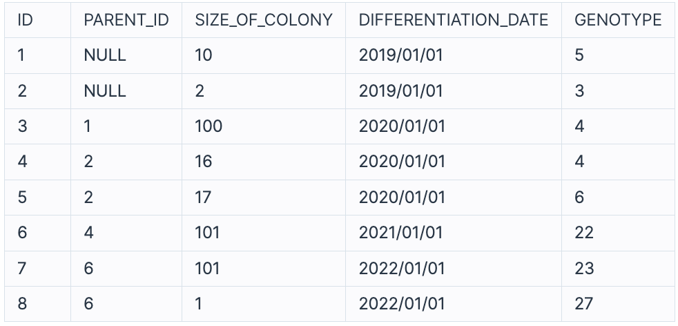 최초의 대장균 개체의 `PARENT_ID` 는 `NULL` 값입니다.